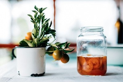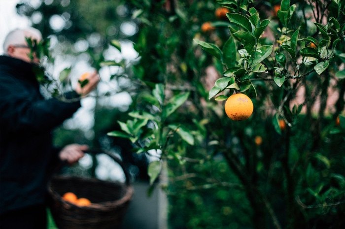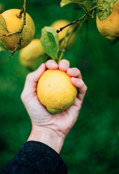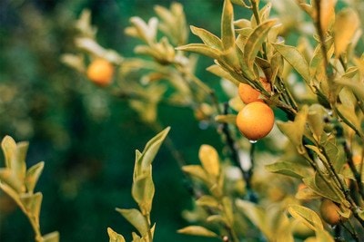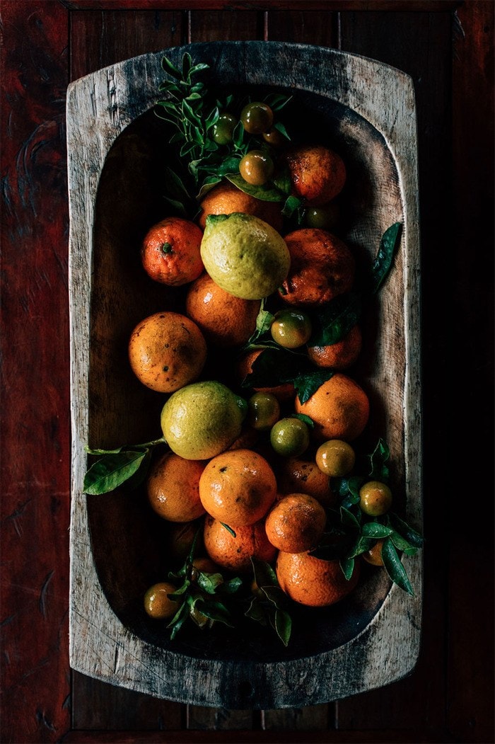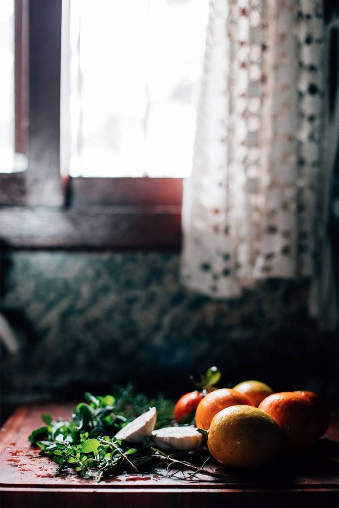 Como os frutos laranjas e amarelos dos cítricos no meio das folhas verdes sob a luz do dia nublado e, logo depois, os mesmos limões e laranjas dourados e queimados na assadeira do frango assado.
