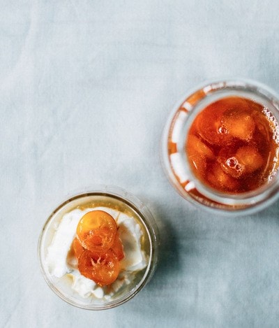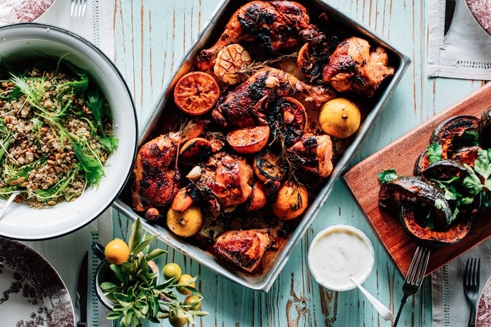 As receitas que escolhi para este almoço foram: Frango Assado com Ervas, Laranja e Limão Siciliano; Abóbora com Molho de Iogurte; Quinoa com Radicchio e Sementes de Abóbora. De sobremesa: Calda de Laranjinhas Kinkan e Mel.